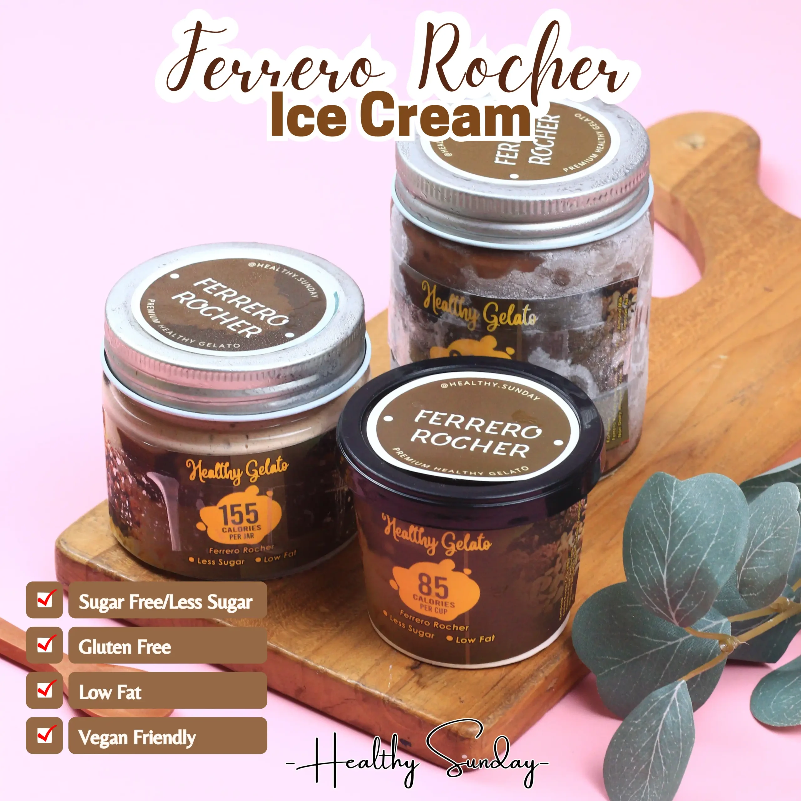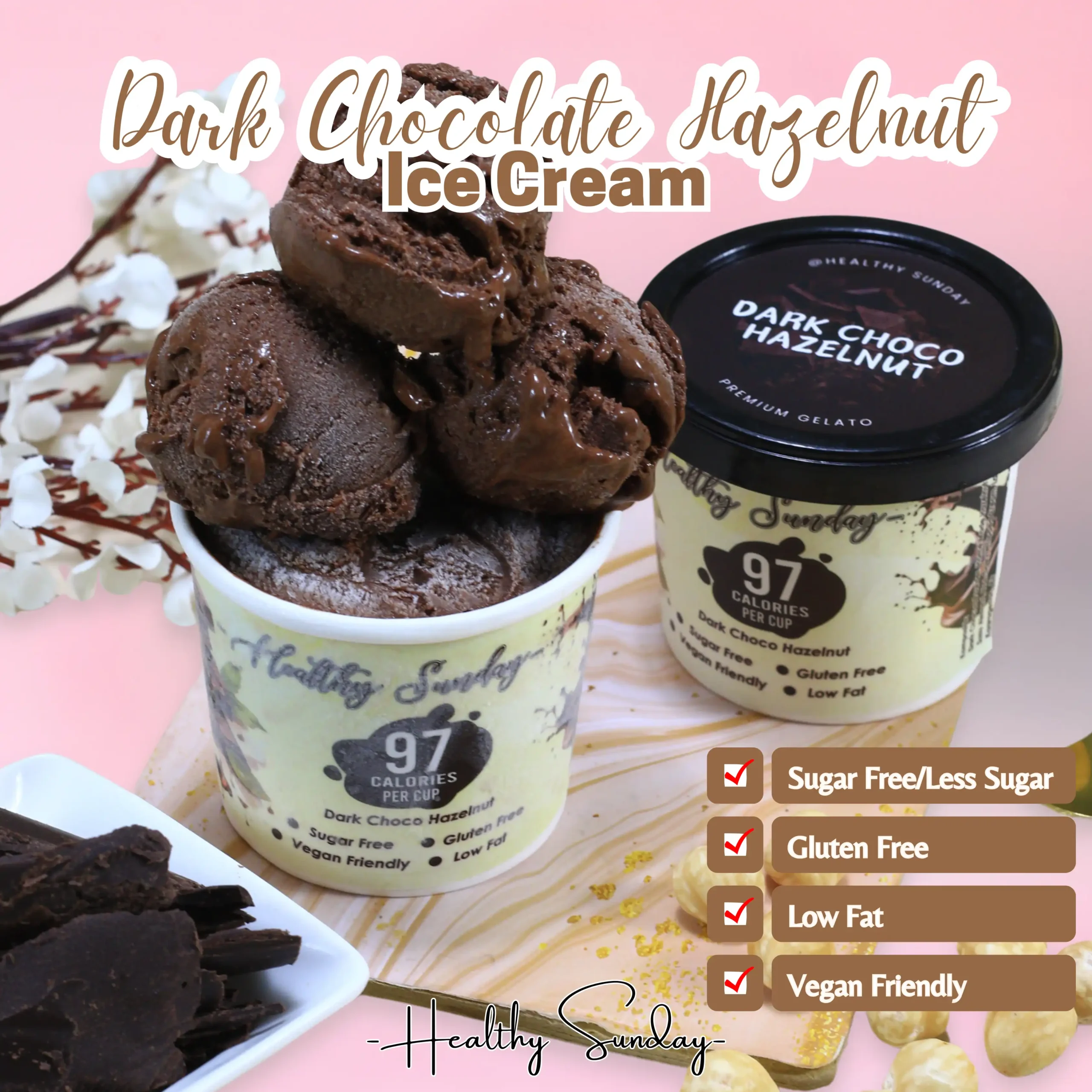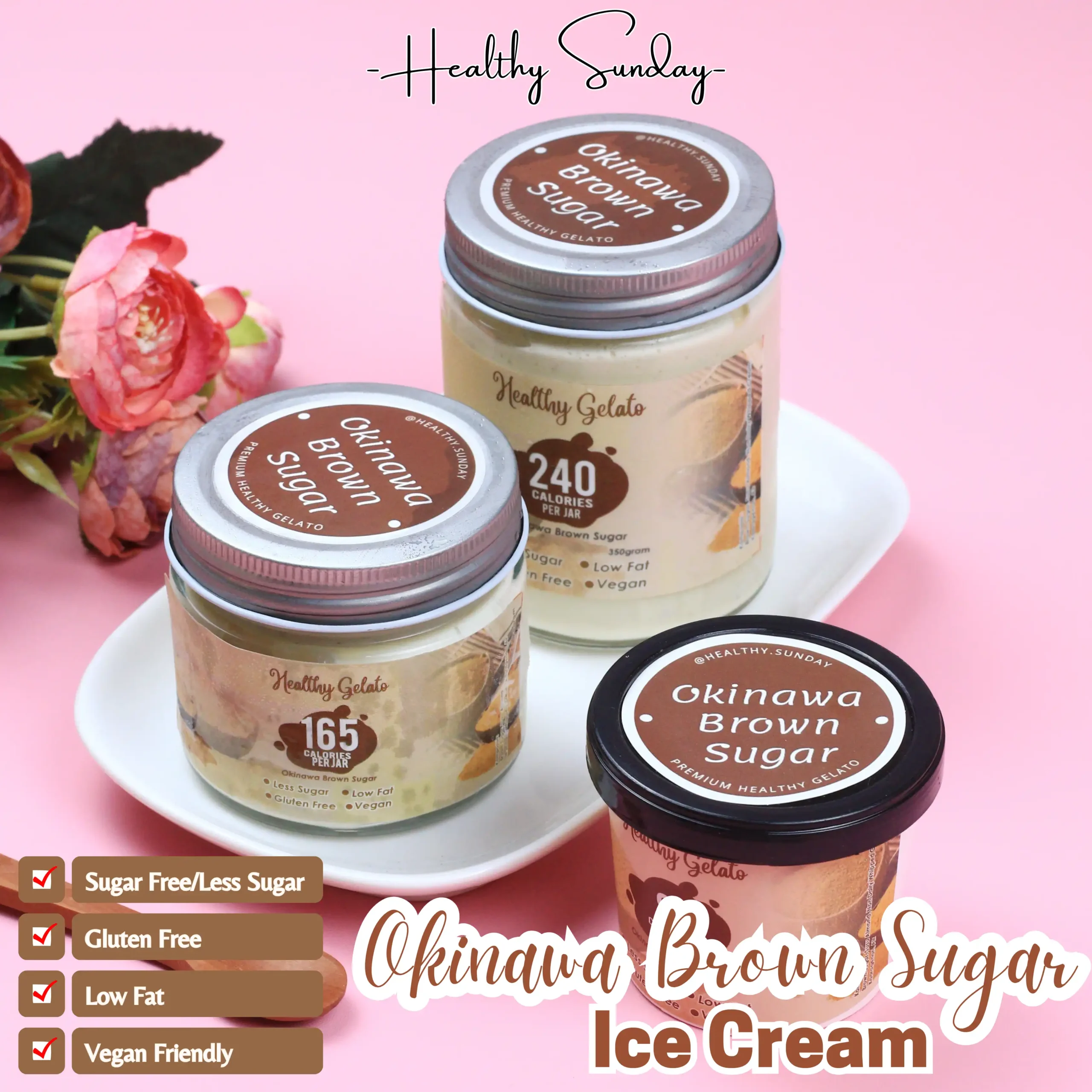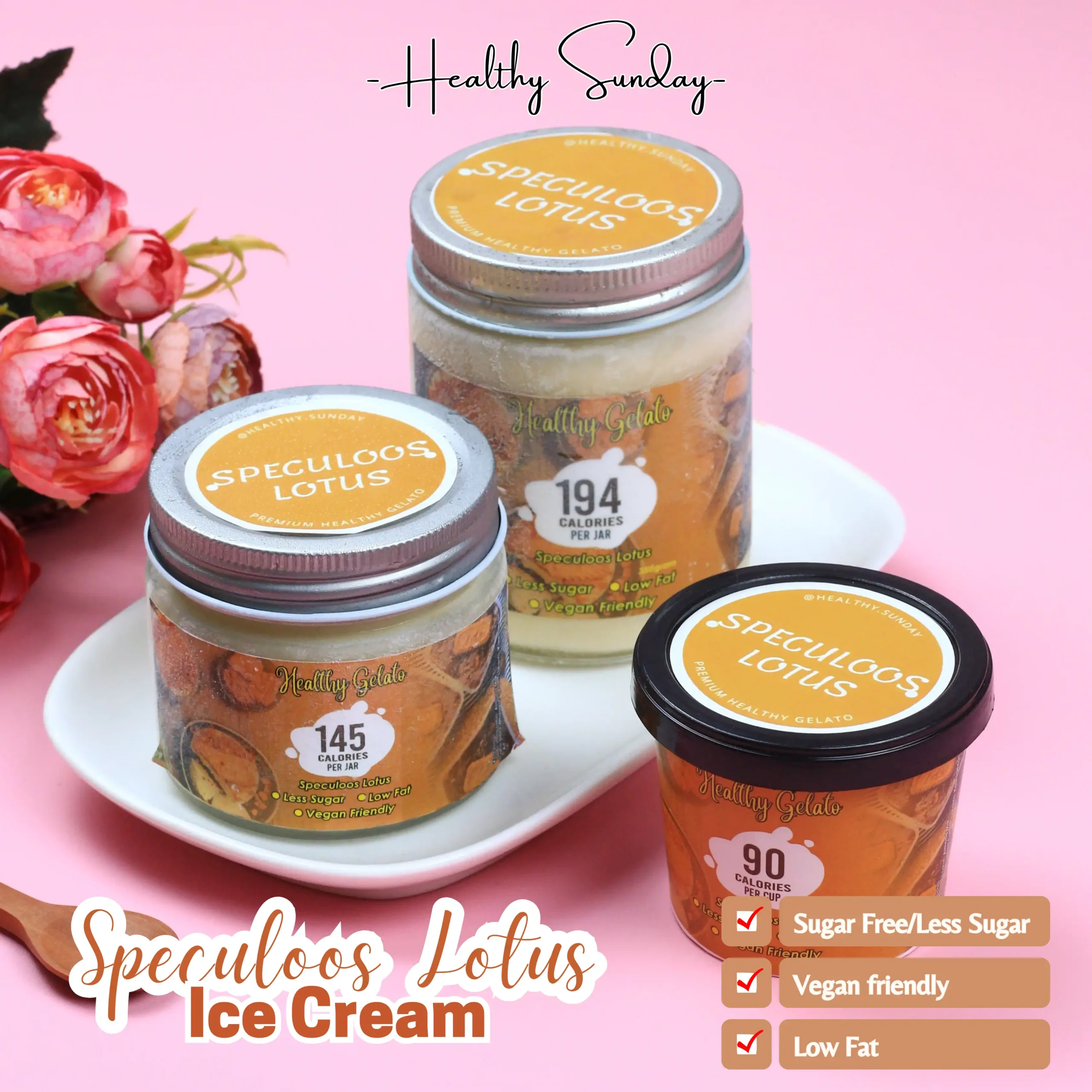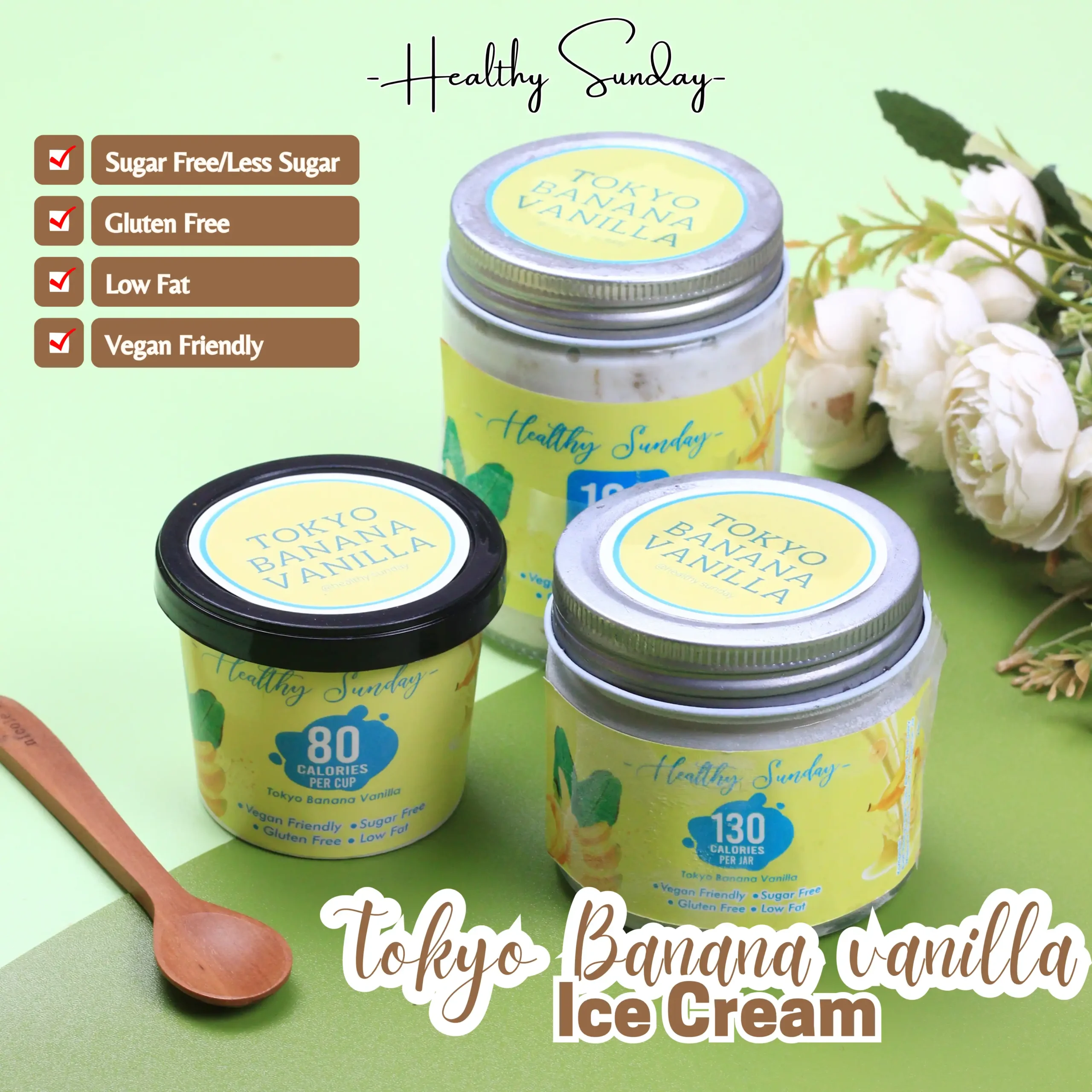 Healthy Sunday menghadirkan pilihan es krim sehat less sugar/sugar free bahkan plain/tawar, gluten free, vegan, low fat dan keto friendly. Kamu bisa custom bahan, rasa sampai ukuran lho! Untuk custom pemesanan maksimal h-3 ya!